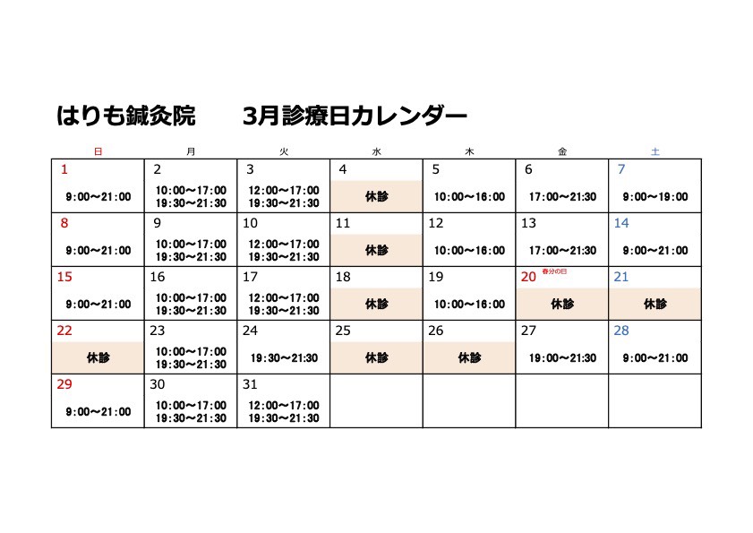 以下のカレンダーが26年3月の営業スケジュールになります。